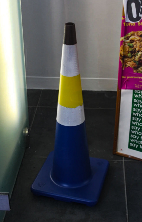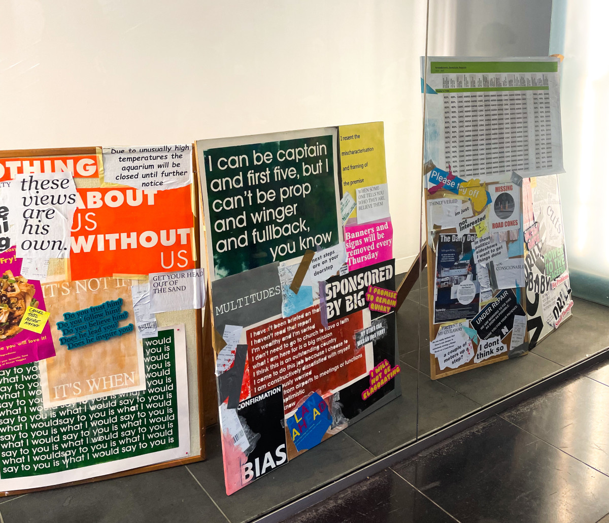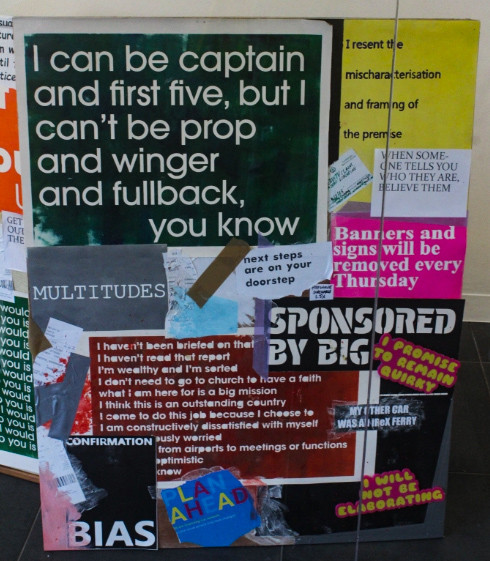 Community Notices! presents a flurry of visual noise: the physical detritus of a community attempting to shout its messages stack on top of each other. I'm selling my couch, blue tack, I'm looking for work, pins, join our town hall, masking tape, advertising a cooking class, sello-tape. Flecks of paint, corners torn away, layer on top of layer, green on red, marker on note paper, cell phone number tear-aways. Yet upon closer inspection, these notices are not what they seem. While they mimic the casual language and form of everyday community boards, each one carries a political message refracted through the familiar aesthetics of public clutter.
