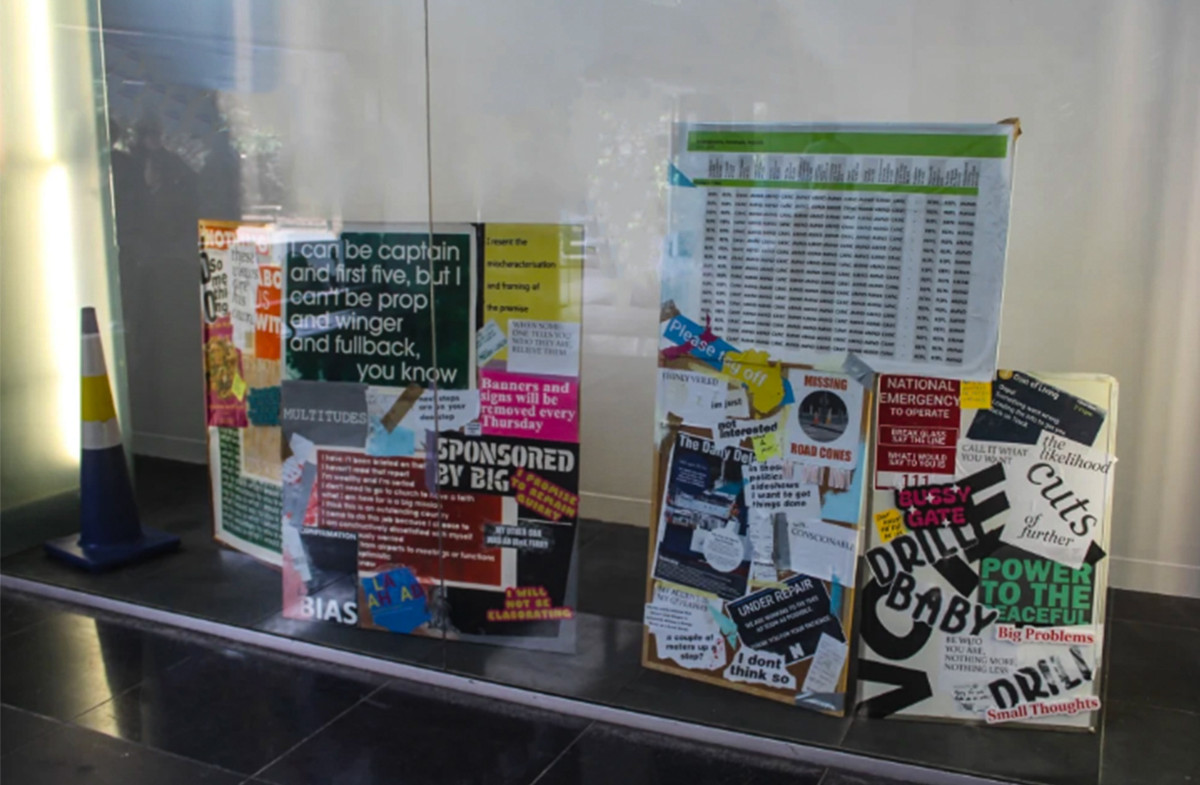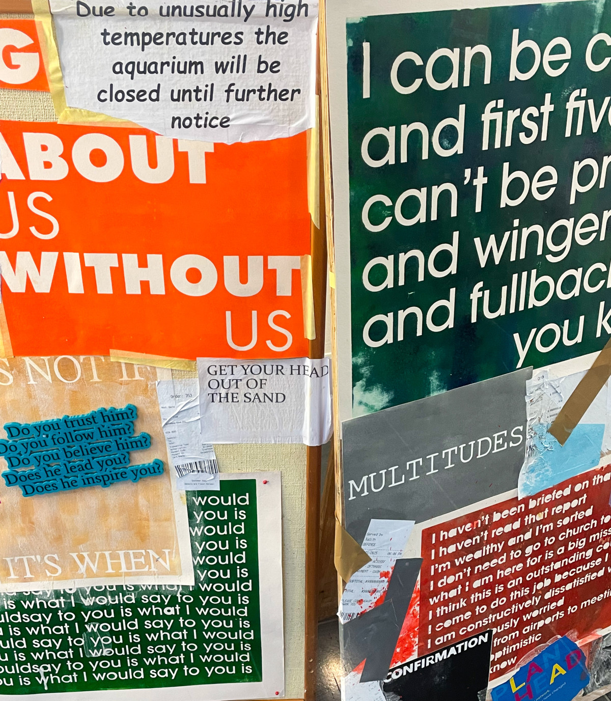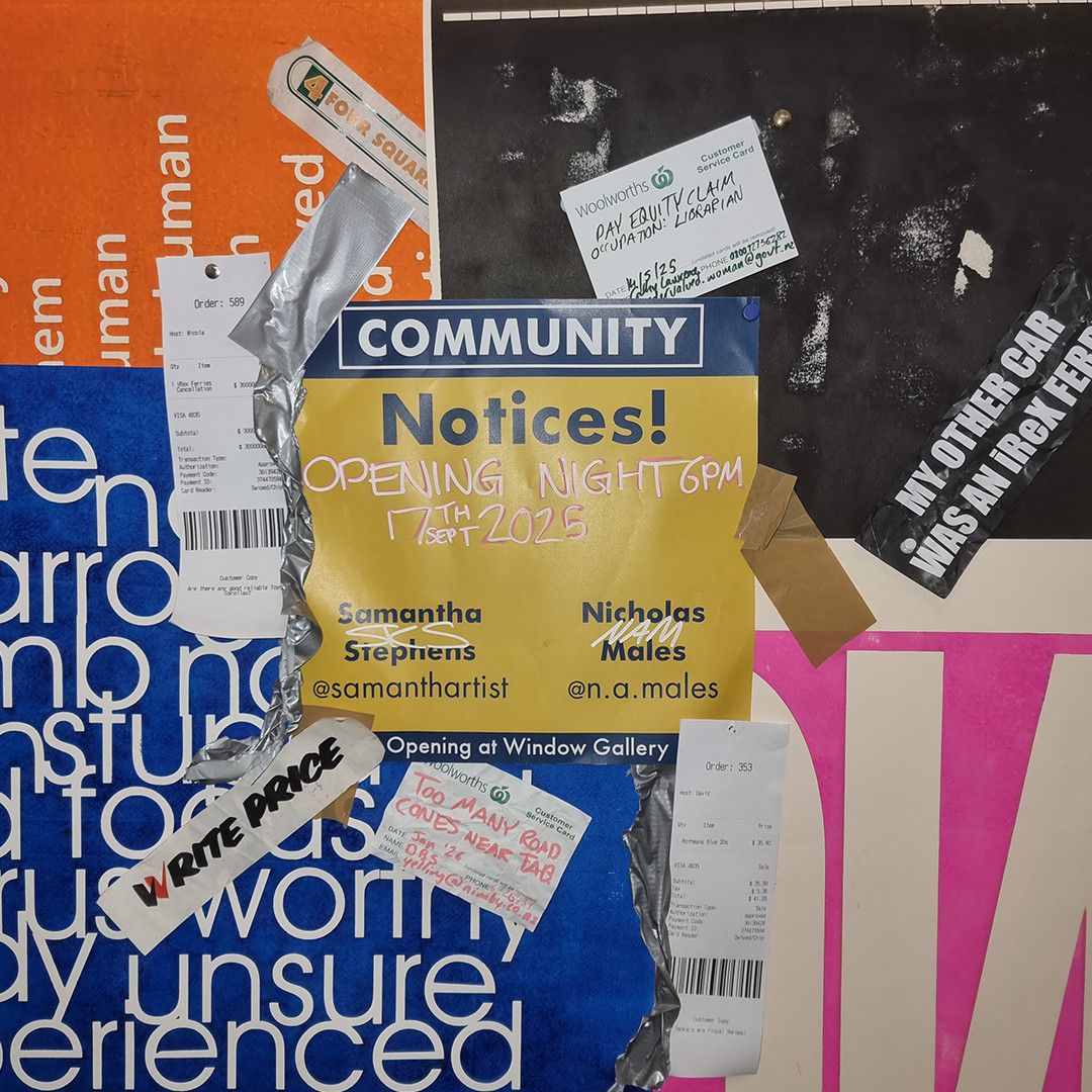 Community Notices! presents a flurry of visual noise: the physical detritus of a community attempting to shout its messages stack on top of each other. I'm selling my couch, blue tack, I'm looking for work, pins, join our town hall, masking tape, advertising a cooking class, sello-tape. Flecks of paint, corners torn away, layer on top of layer, green on red, marker on note paper, cell phone number tear-aways. Yet upon closer inspection, these notices are not what they seem. While they mimic the casual language and form of everyday community boards, each one carries a political message refracted through the familiar aesthetics of public clutter.