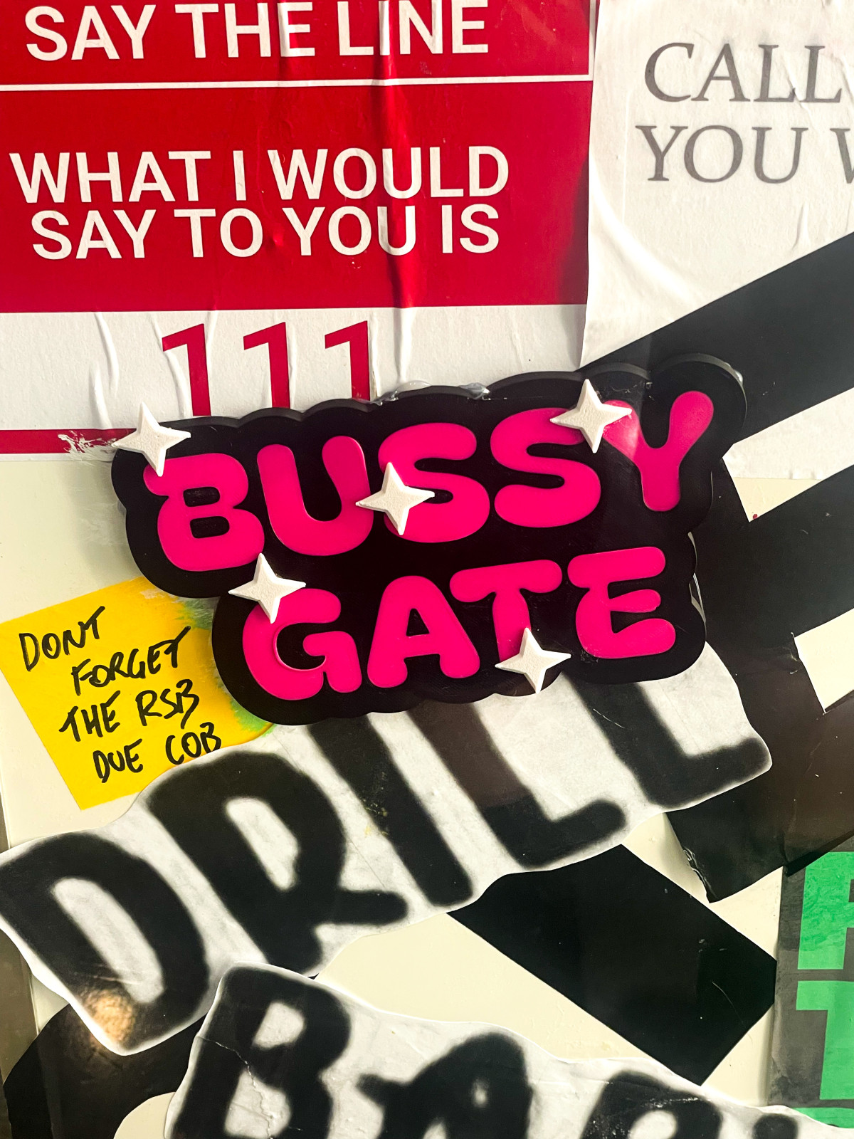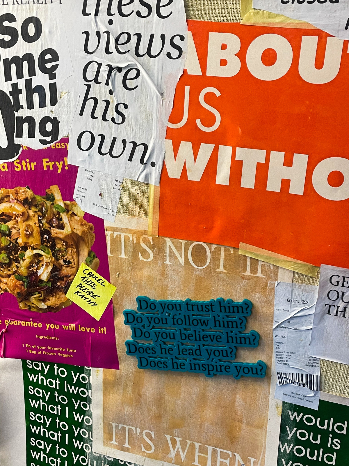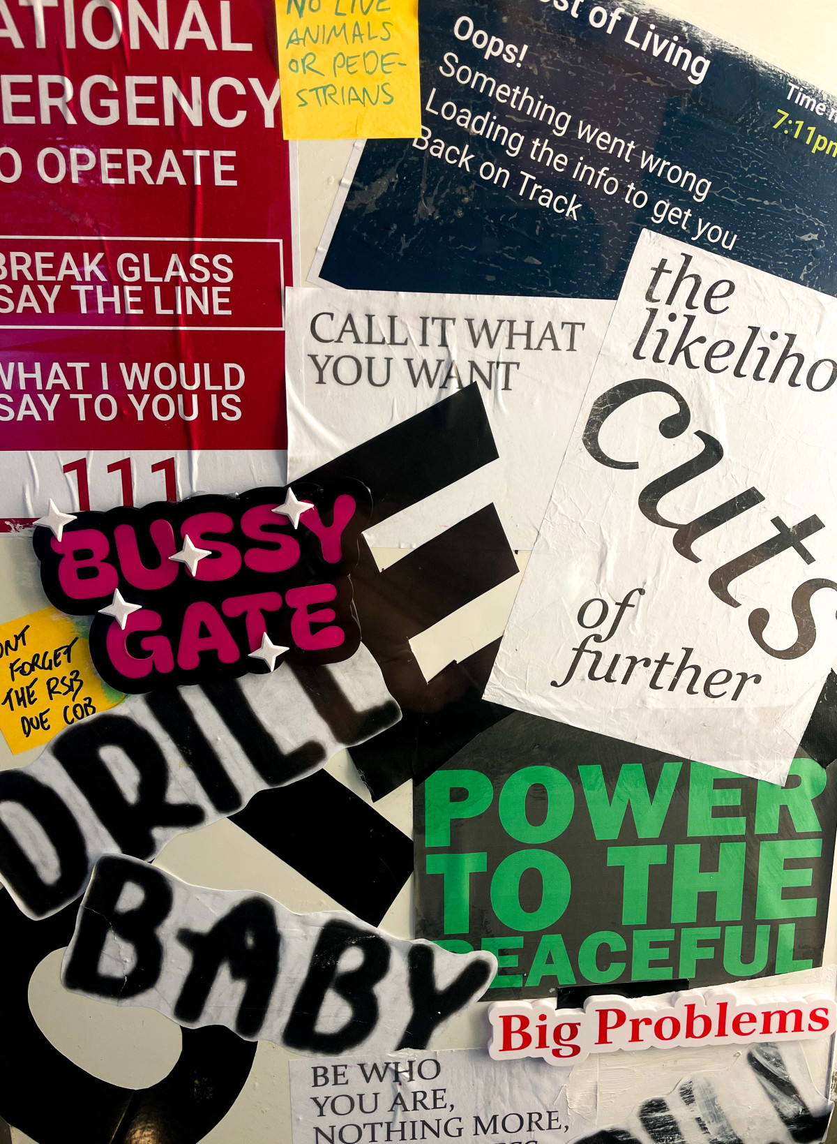 Community Notices! presents a flurry of visual noise: the physical detritus of a community attempting to shout its messages stack on top of each other. I'm selling my couch, blue tack, I'm looking for work, pins, join our town hall, masking tape, advertising a cooking class, sello-tape. Flecks of paint, corners torn away, layer on top of layer, green on red, marker on note paper, cell phone number tear-aways. Yet upon closer inspection, these notices are not what they seem. While they mimic the casual language and form of everyday community boards, each one carries a political message refracted through the familiar aesthetics of public clutter.
